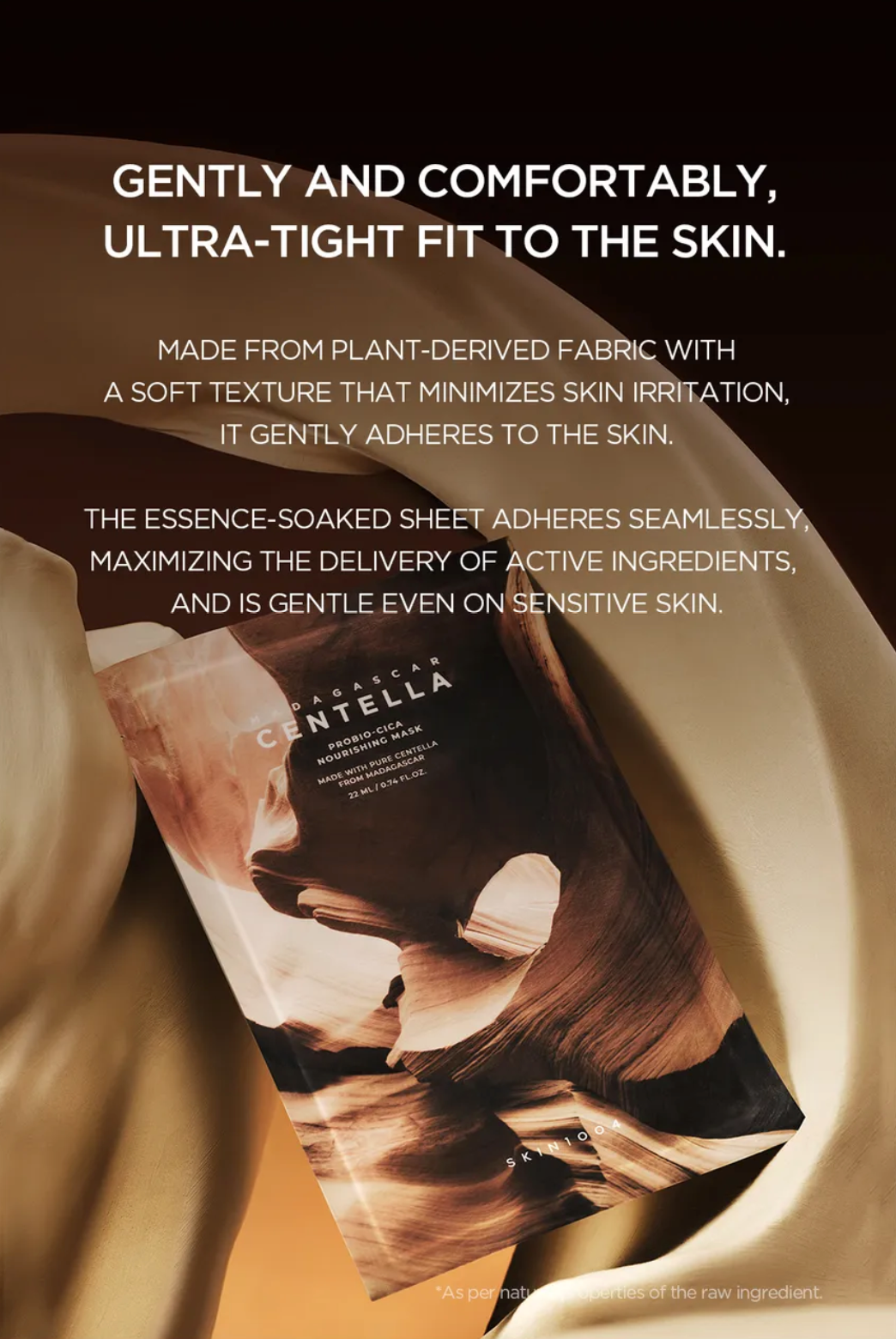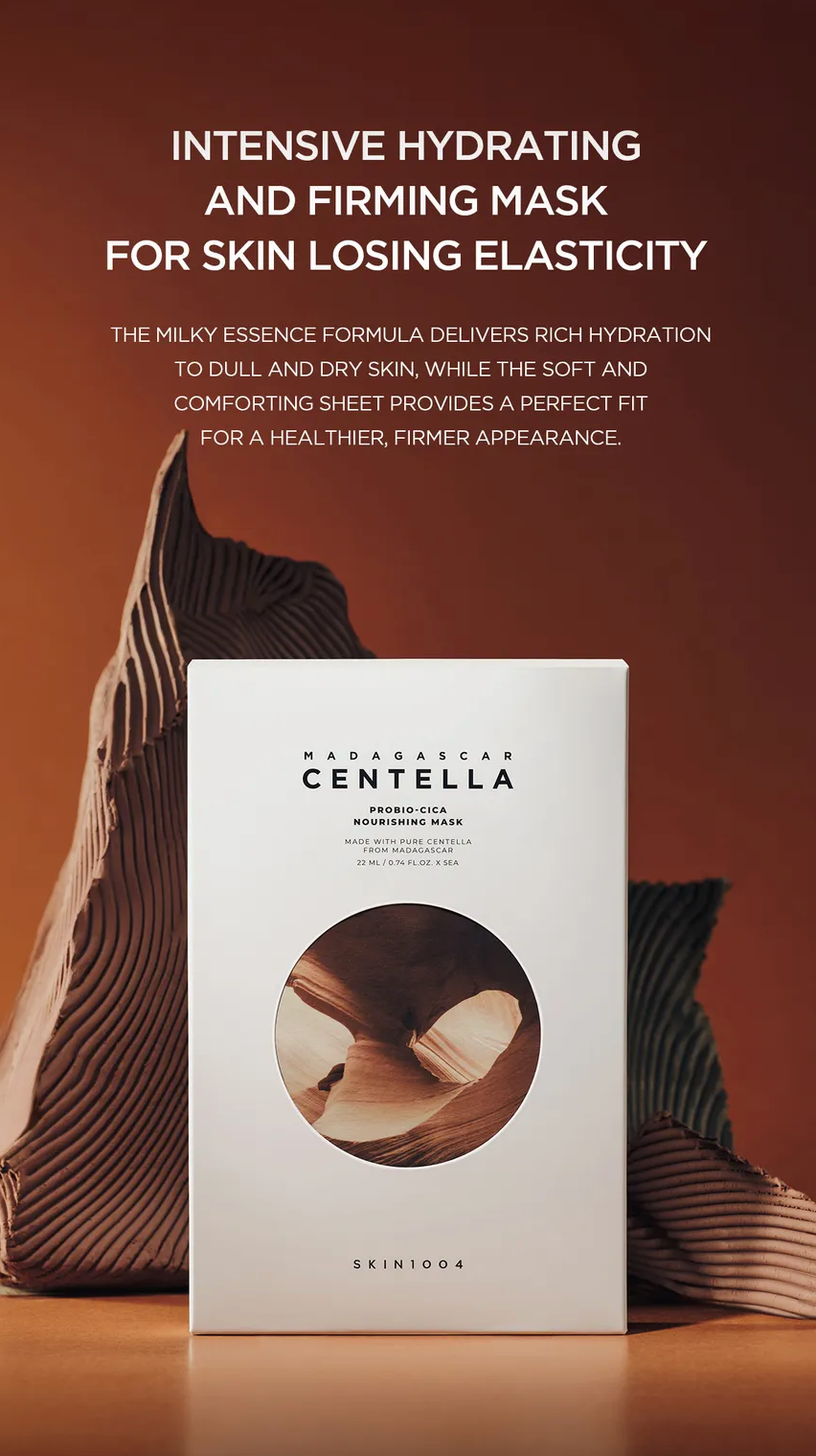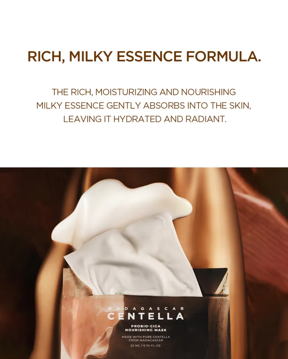 SKIN1004 Probio-Cica Nourishing Mask je výživná maska v plátýnku, která intenzivně hydratuje, zklidňuje a podporuje pevnost pleti. Obsahuje fermentovanou Centellu z Madagaskaru pro hlubší vstřebávání aktivních látek, ceramidy pro posílení kožní bariéry a 9peptidový komplex pro obnovu elasticity a mladistvý vzhled. Bohatá mléčná esence zanechává pleť hebkou, vyživenou a rozzářenou.