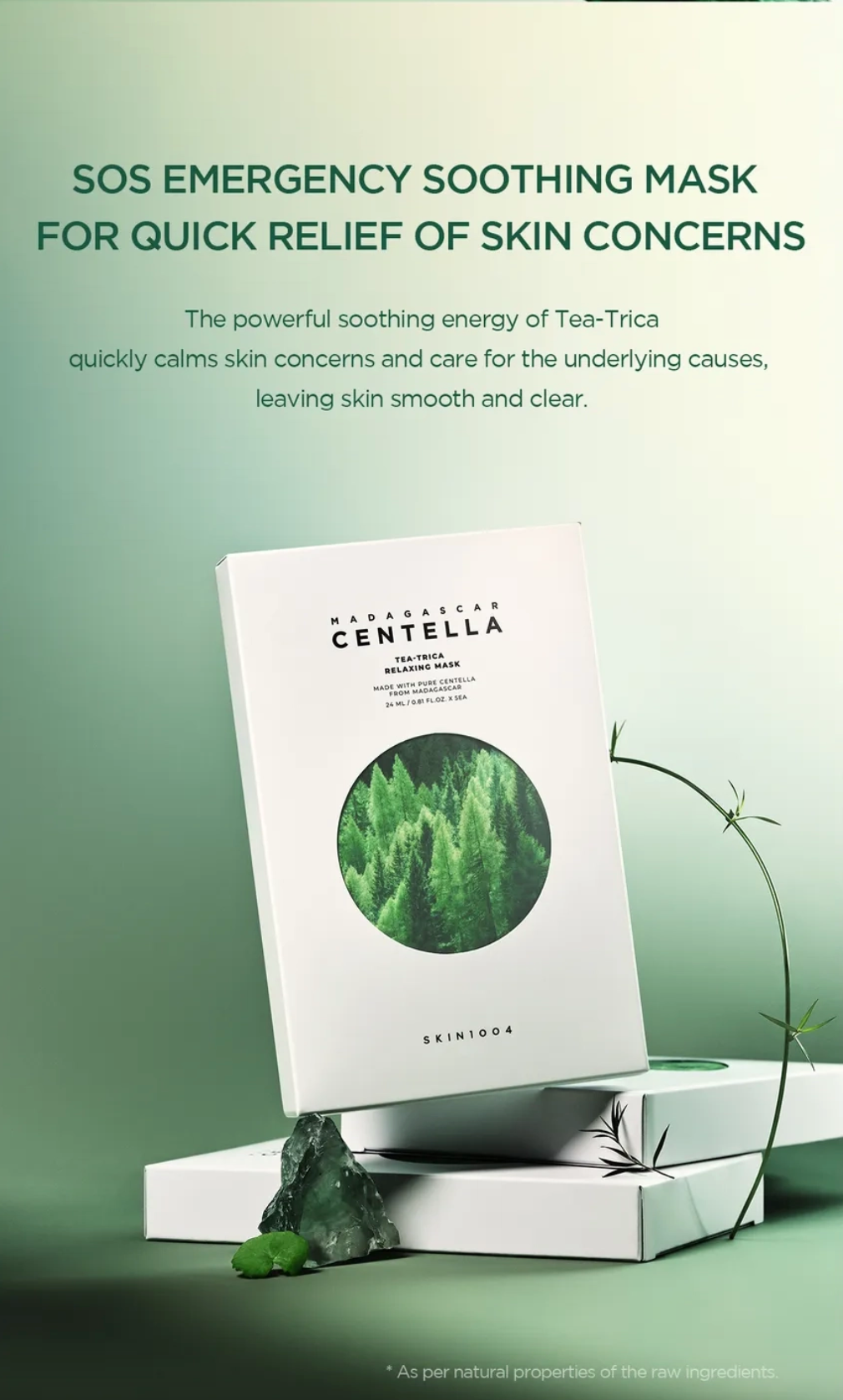 SKIN1004 Tea-Trica Relaxing Mask je zklidňující maska v plátýnku určená pro mastnou, aknózní a citlivou pleť. Kombinuje Tea Tree komplex, madagaskarskou Centellu a kyselinu salicylovou, které společně pomáhají redukovat nedokonalosti, čistit póry a udržovat pleť v rovnováze. Lehká, svěží esence se rychle vstřebává a nezanechává mastný film.