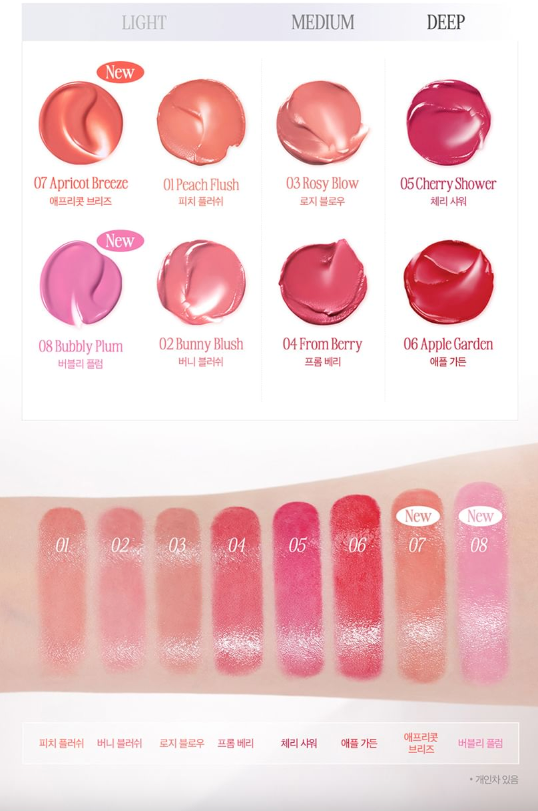 CLIO Essential Lipcheek Tap je 2v1 balzám určený na rty i tváře. Obsahuje hydratační složku s vitaminem E acetátem a skvalanem, které vyživují rty, zatímco dávají zdravý zářivý efekt. Textura se při styku s teplotou prstů jemně roztaví a umožňuje lehké vrstvení – můžete dosáhnout jemného denního líčení nebo výraznějšího efektu dle potřeby.