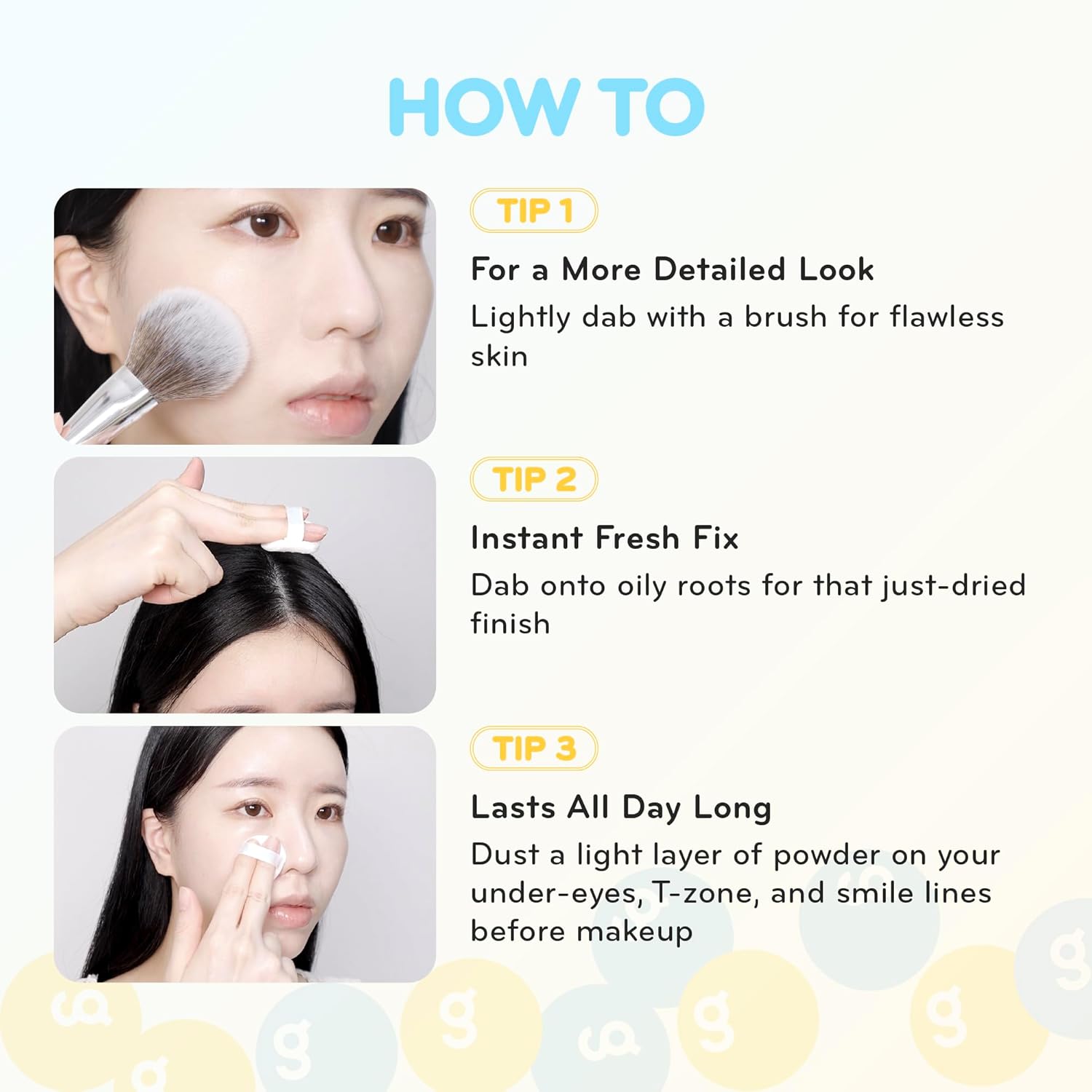 Naneste po dokončení make-upu nebo během dne pro okamžité zmatnění a sjednocení textury. Pudr lze nanášet na T-zónu, mastné partie nebo i na kořínky vlasů.