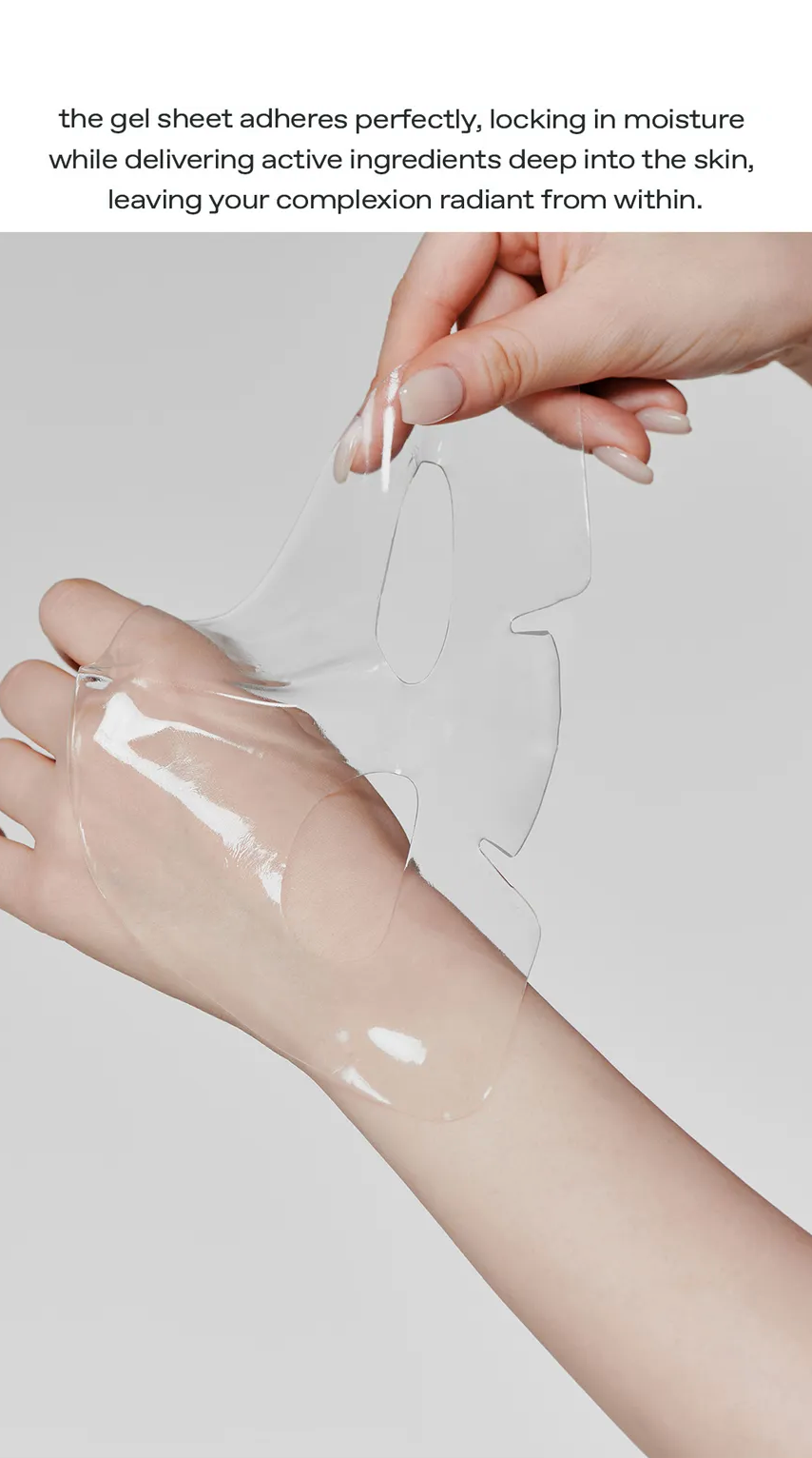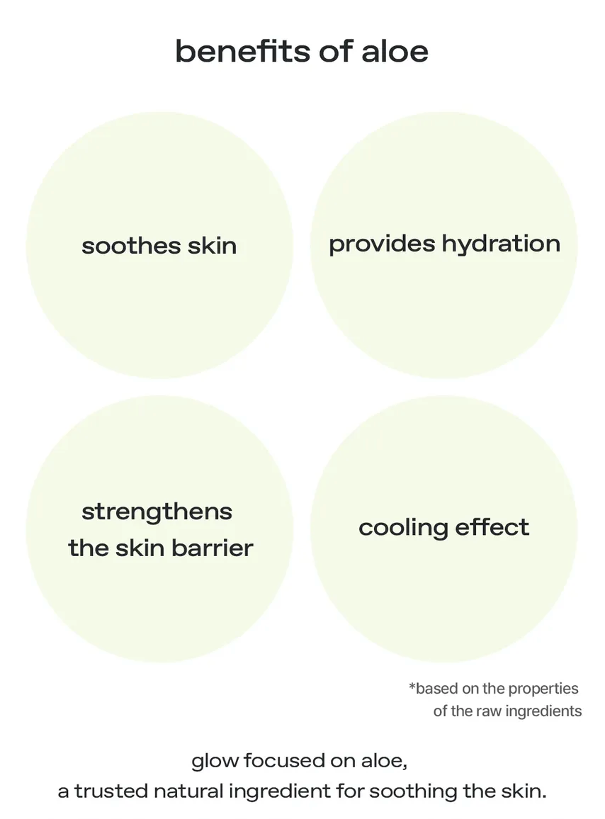 glow Aloe Hydrogel Sheet Mask je hydrogelová maska, která poskytuje dlouhodobou hydrataci a zklidnění pleti. Obsahuje 10 000 ppm Aloe Barbadensis (Aloe Vera) Leaf Extract, který hydratuje a uklidňuje podrážděnou pleť. Maska je obohacena o niacinamid, panthenol, betain a Chondrus Crispus, které pokožku vyživují a podporují její zdravý vzhled. Hydrogelový materiál zajišťuje optimální přilnavost k pleti a efektivní uzamčení vlhkosti.